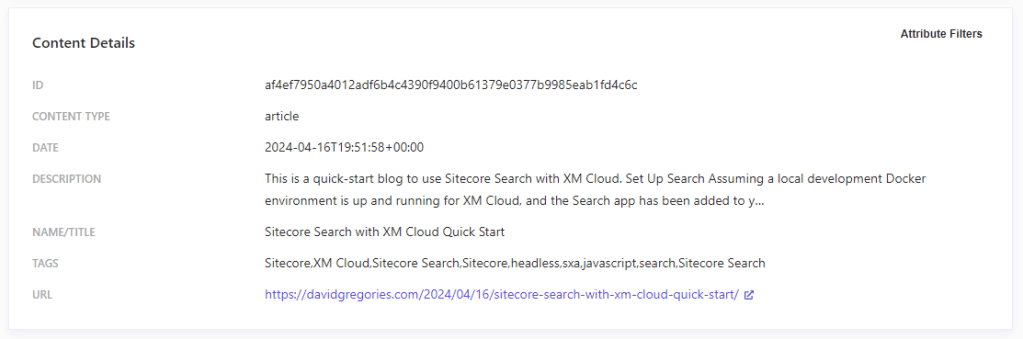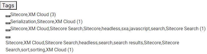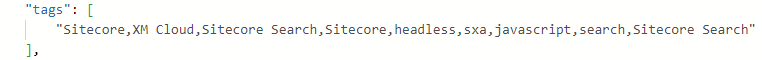 I was expecting—and trying to populate it so—each string would have quotes around it. That is what is shown on the Working with Attributes page under the “Attribute data types and accepted formats” section of the Sitecore Search documentation (see References). No matter what I tried, I got quotes around the entire array of strings, thereby always making it an array of one string, containing many comma separated strings. I gave up trying to populate this correctly and decided to fix it in code with my own custom facet, still utilizing the Tags attribute.