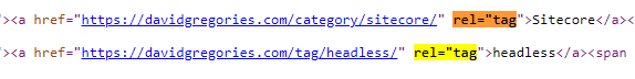 I’ve been adding tags to my blogs in WordPress, so I look at the source of my blogs and see that the tags are wrapped in an anchor tag with the rel="tag" property: